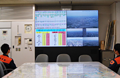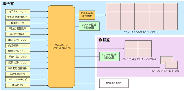 指令室の大型マルチディスプレイは、表示する映像の配置や大きさを自由に変更できます。リアプロジェクターの台数に制限されることなく、状況に応じた映像切替えが可能です。 映像切替えやレイアウト変更を操作するシステム監視制御装置は、ひと目でわかりやすい シンプルな画面としました。通報者から的確な情報を聞出すと同時に車両選別や支援情報発信などを行う指令管制員の機器操作の負担を軽減し、迅速な消防・救急活動をサポートしています。 隣接する作戦室では、指令室と同じ映像情報を55インチ4面ディスプレイに表示できます。大規模災害時にも周辺地図や市街地カメラ映像など必要な複数の情報を任意に表示し、消防局全体が一丸となり適正な判断ができるよう万全な体制を整えています。 ![]() *Digital Light Processing, DLPはテキサス・インスツルメンツ社の登録商標です。 |